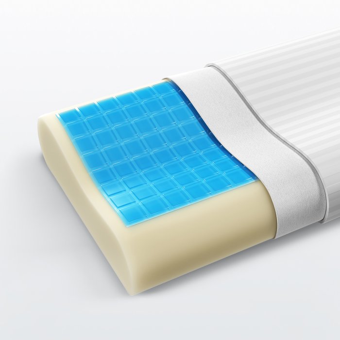Подушка анатомической формы с охлаждающим гелем «Aquagel». Особый состав геля сохраняет изначальную температуру и не нагревается в первые несколько минут использования подушки. Приятная прохлада способствует расслаблению и переход в быструю фазу сна будет комфортным и более эффективным. Чехол всех моделей подушек выполнен из хлопкового страйп-сатина. Эта натуральная ткань, используемая для качественного постельного белья, прекрасно дышит, и обеспечивает отличный воздухообмен.